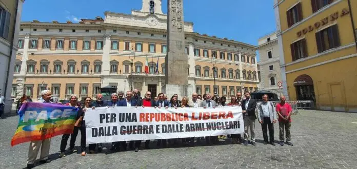 Al termine della conferenza stampa i rappresentanti delle associazioni si sono ritrovati davanti a Montecitorio per esporre uno striscione dove c’era scritto Per una Repubblica libera dalla guerra e dagli armi nucleari.