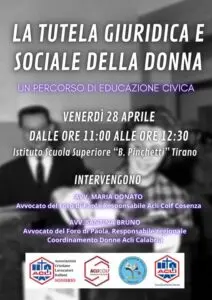 Grazie al gemellaggio tra le Acli Colf di Cosenza e quelle di Sondrio, il prossimo 28 aprile, dalle ore 11.00 alle ore 12.30 si svolgerà l’incontro di educazione civica, dal titolo “La tutela giuridica e sociale della donna”, presso l’istituto Scuola Superiore “B. Pinchetti”, a Tirano (SO).