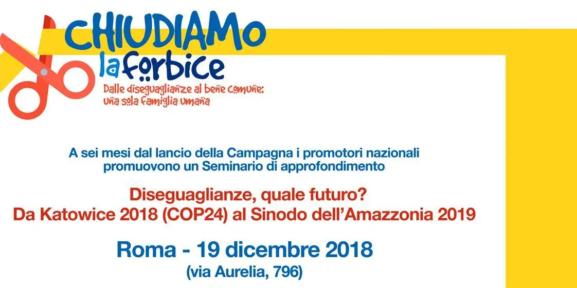 A sei mesi dal lancio della campagna “Chiudiamo la forbice” i promotori, tra i quali Acli nazionali, Caritas, Azione Cattolica e diverse altre sigle, promuovono a Roma un Seminario di approfondimento su sfida climatica, giusta transizione economica, difesa della biodiversità.In un mercato globale dominato da poche multinazionali, diverse comunità e movimenti locali, nazionali e internazionali si stanno spingendo verso la sostenibilità ambientale e sociale. Buone pratiche che, seppure ancora poco visibili, stanno valorizzando l’economia locale proponendo al tempo stesso una politica di intervento portatrice di innovazione e inclusione delle persone più povere. Temi che ci riguardano tutti, come singoli, famiglie, comunità, società civile.Siamo all’indomani di importanti eventi dedicati alla salvaguardi dell’ambiente. La Conferenza sul Clima 2018 a Katowice in Polonia COP24, con l’invito a tutte le realtà presenti a raggiungere velocemente ed insieme gli obiettivi fissati dagli accordi di Parigi.Il raduno mondiale “Prophetic Economy”, tenutosi a Castelgandolfo (Roma), con 500 partecipanti provenienti da oltre 40 Paesi dei cinque continenti, per uno scambio interattivo e intergenerazionale sul grande tema profetico “mettere insieme ecologia ed economia”.Il prossimo grande appuntamento sarà il Sinodo dell’Amazzonia 2019, in cui si parlerà del forte impegno dei Vescovi latino-americani per la terra e per migliori condizioni di vita nelle grandi periferie urbane. Attività che è minacciata dalla costruzione di grandi centrali idroelettriche, dall’avanzata di monoculture intensive, dall’attività estrattiva indiscriminata, dalla deforestazione dell’Amazzonia, polmone vitale per l’intero pianeta, senza dimenticare l’aumento della violenza, del narcotraffico, della tratta di essere umani.“Chiudere la forbice” delle diseguaglianze significa approfondire e confrontarsi su questi temi sotto l’aspetto spirituale, sociale ed economico, condividere cammini di cittadinanza attiva, in Italia come in ogni parte del mondo per difendere la “biodiversità” e i diritti delle popolazioni locali.“Chiudere la forbice” delle diseguaglianze richiama tutti a rafforzare l’azione comune educativa e di animazione nei territori, per contribuire a sviluppare comunità sempre più consapevoli e aperte a quella “rivoluzione culturale” esplicitata nella Laudato Sì.L’enciclica indica la via da seguire, ispiratrice di valori etici e spirituali da coniugare con il nostro concreto vivere quotidiano, con i nostri stili di vita e l’impegno sociale. Il cambiamento non può essere disgiunto dalla salvaguardia del creato e dell’ambiente che ci circonda, in una visione di pace e giustizia che sia per tutti gli uomini aspirazione continua.Nella prima sessione del Seminario interverranno Matteo Mascia, Coordinatore Progetto Etica e Politiche ambientali – Fondazione Lanza, Tomas Insua, Direttore esecutivo del Global Catholic Climate Movement e Paolo Venezia, Responsabile Slow Food RomaSeguirà un dibattito con le realtà aderenti alla Campagna, con l’obiettivo di elaborare un Manifesto di sostegno in vista del Sinodo in Amazzonia (ottobre 2019).Una seconda sessione si terrà nel pomeriggio, dedicata prevalentemente agli operatori delle realtà territoriali, suddivisa in singoli “Laboratori tematici” allo scopo di approfondire i vari temi.