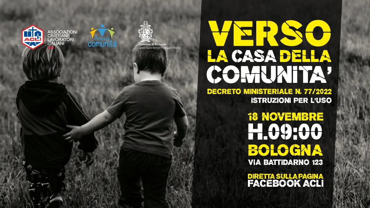 Il 18 novembre, dalle 9 alle 17, si svolgerà a Bologna, via Battidarno 123, il convegno “Verso la Casa della Comunità, decreto ministeriale n.77/2022: istruzioni per l’uso”, organizzato dalle Acli e dall’associazione “Prima la comunità” e patrocinato dal Comune di Bologna.