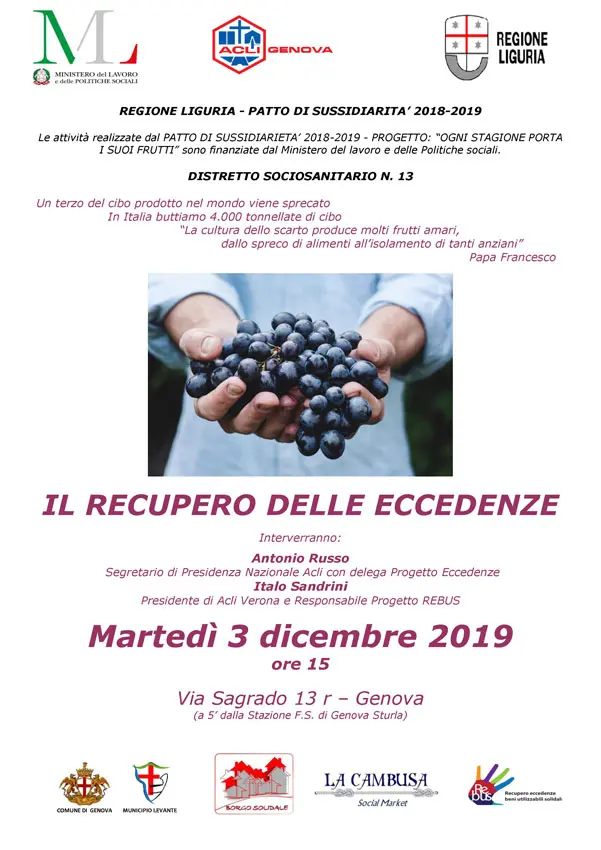 “Recupero delle eccedenze” è una bella iniziativa che si terrà il 3 dicembre a Genova, promosso dalle ACLI con ACLI provinciali di Genova e il patrocinio del Ministero del lavoro e della Regione Liguria.