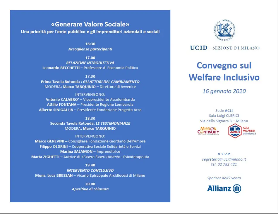 “Generare Valore Sociale. Una priorità per l’ente pubblico e gli imprenditori aziendali e sociali”, è il tema del convegno annuale sul Welfare inclusivo promosso da UCID Milano (Unione Cristiana Imprenditori e Dirigenti) in collaborazione con ACLI Milanesi e Mission Continuity.