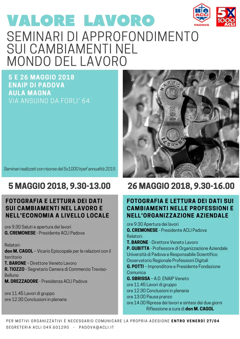 Le date sono il 5 e 26 maggio. Il primo appuntamento sarà dedicato alla “Fotografia e lettura dei dati sui cambiamenti nel lavoro e nell\’economia a livello locale”, e aperto dal presidente delle Acli di Padova Gianni Cremonese, tra i relatori anche Tiziano Barone, Direttore di Veneto Lavoro, Romano Tiozzo, Segretario della Camera di Commercio di Treviso-Belluno e Maurizio Drezzadore della presidenza delle ACLI Padova.