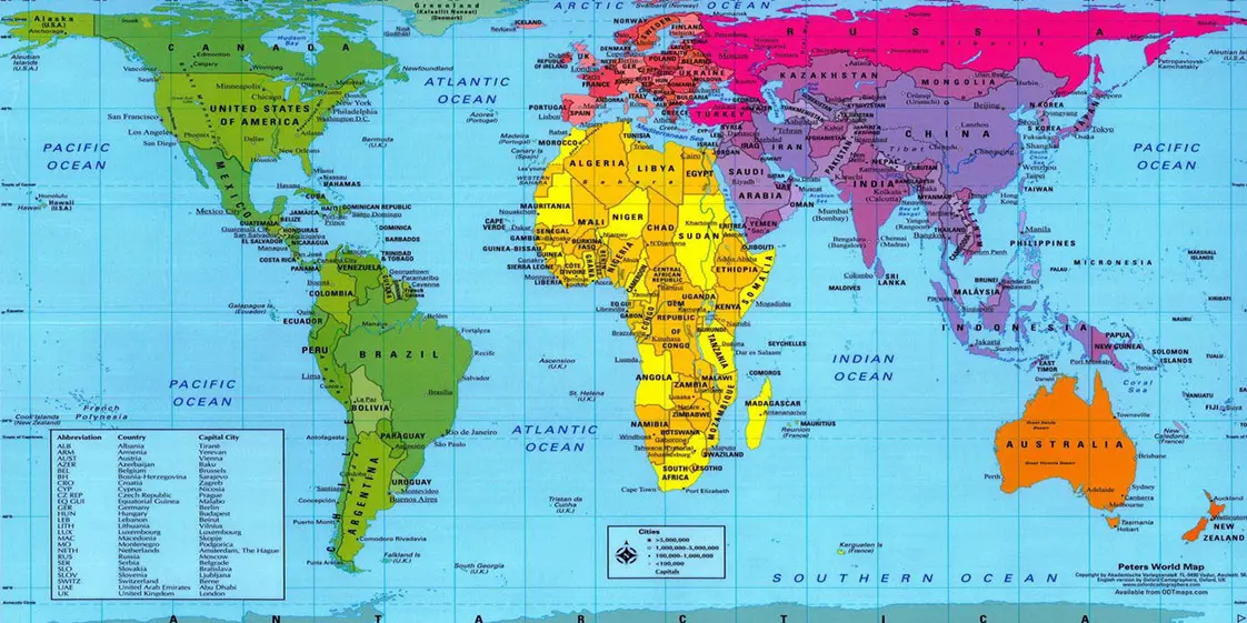 Più di 400 anni dopo, uno storico e cartografo tedesco Arno Peters ha realizzato una Carta – che prende appunto il nome di Carta di Peters – con l’obiettivo di mantenere le proporzioni, attraverso una scomposizione del mondo in 100 parti orizzontali e 100 verticali e a una rappresentazione che mantiene sempre gli ortogonali, su un piano a due dimensioni, i meridiani e i paralleli. Quello che Peters voleva recuperare – anche attraverso il rispetto delle dimensioni di ogni singolo Paese – era la dignità di ogni popolo, la sua giusta dimensione. Una lettura “anticoloniale” che dà al Sud del mondo la stessa importanza del Nord. Sapendo che ogni proiezione della sfera sul piano impone delle deformazioni, Peters si rese conto che l’esatta proporzione delle superfici andava a scapito dell’esattezza delle distanze. I continenti nella sua Carta assumono così una forma allungata. Dunque la Carta di Peters non è perfetta ma certamente più rappresentativa di quella di Mercatore.
