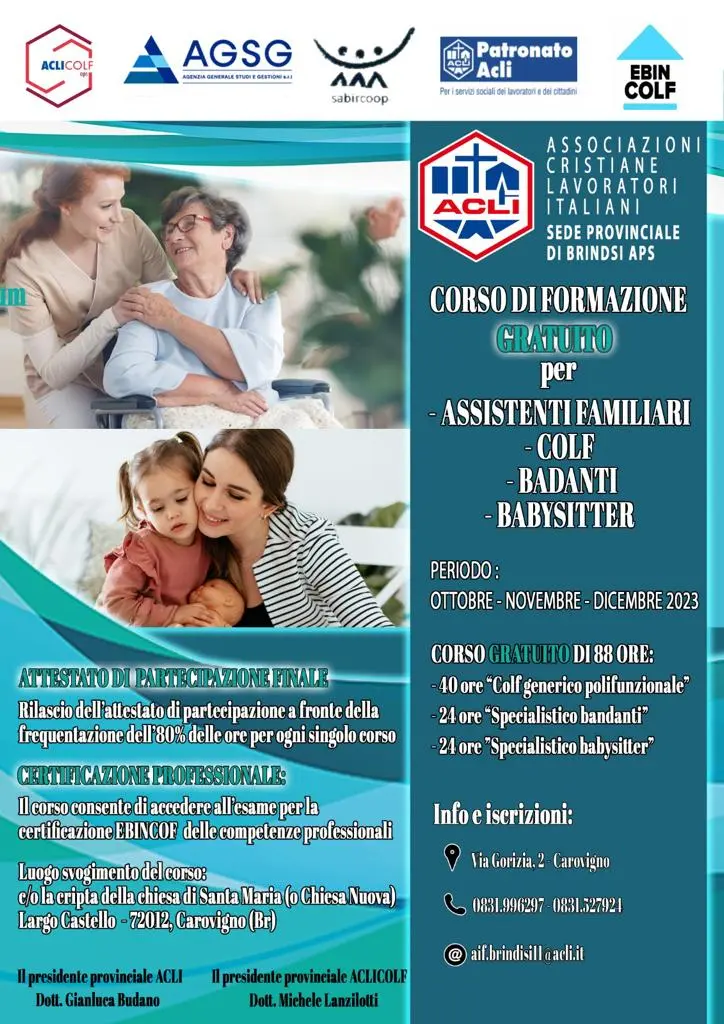 Le Acli Colf di Brindisi stanno organizzando il prossimo corso di formazione rivolto a colf, badanti e baby-sitter. Il percorso formativo, della durata complessiva di 88 ore, sarà completamente gratuito e partirà nel mese di ottobre.