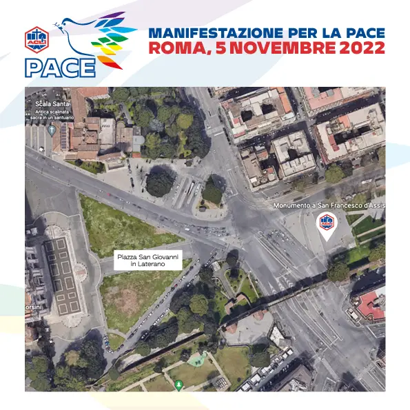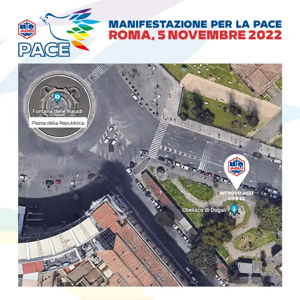 Sono decine di migliaia le persone attese alla grande manifestazione per la Pace convocata dalla Coalizione “Europe for Peace” per sabato 5 novembre a Roma, con l’arrivo già confermato di decine tra treni speciali e autobus. Il ritrovo dei partecipanti è previsto per le ore 12:00 in Piazza della Repubblica, con successiva partenza del corteo alla volta di piazza San Giovanni in Laterano dove dalle 14:30 inizierà la diffusione dal palco dei contenuti e delle richieste esplicitate nella Piattaforma di convocazione. L’appuntamento per tutti gli aclisti è alle 12 in Piazza della Repubblica – Obelisco dei Dogali o alle ore 15,00 presso il Monumneto a San Francesco adiacente piazza San Giovanni in Laterano (in allegato le mappe con i 2 punti di ritrovo)