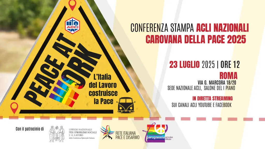 Mercoledì 23 luglio alle ore 12.00, presso la sede nazionale delle ACLI in via G. Marcora 18/20 a Roma, si terrà la conferenza stampa di presentazione di “Peace at Work – L’Italia del lavoro costruisce la pace”, la nuova campagna delle ACLI per promuovere la pace, il disarmo e la giustizia sociale a partire dal mondo del lavoro.