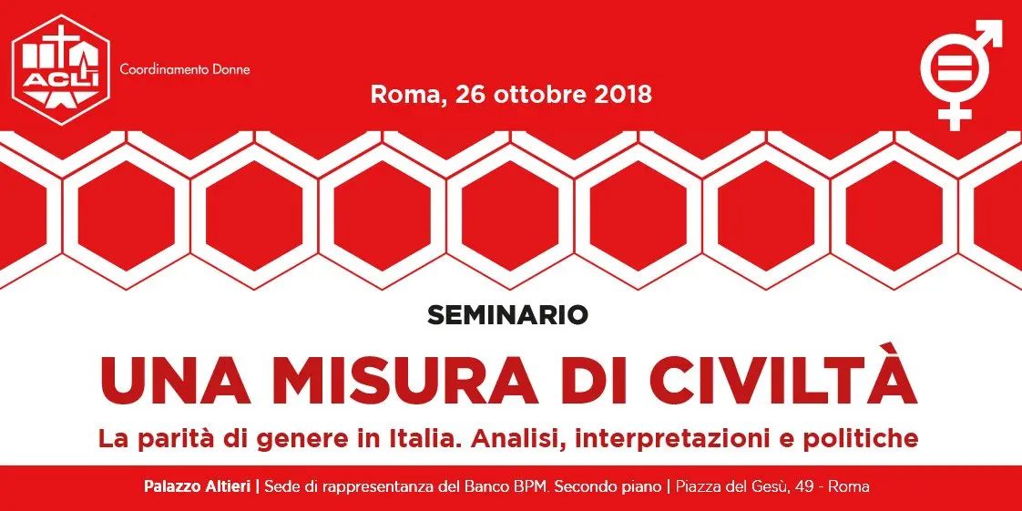 Si terrà il 26 ottobre presso Palazzo Altieri, in piazza del Gesù a Roma, a partire dalle ore 10.00, un seminario organizzato dal Coordinamento Donne delle Acli, dal titolo: “Una misura di civiltà. La parità di genere in Italia. Analisi, interpretazioni e politiche” a cui parteciperanno la senatrice Nunzia Catalfo, la senatrice Donatella Conzatti, l’ex ministro Valeria Fedeli e il senatore Nazario Pagano.