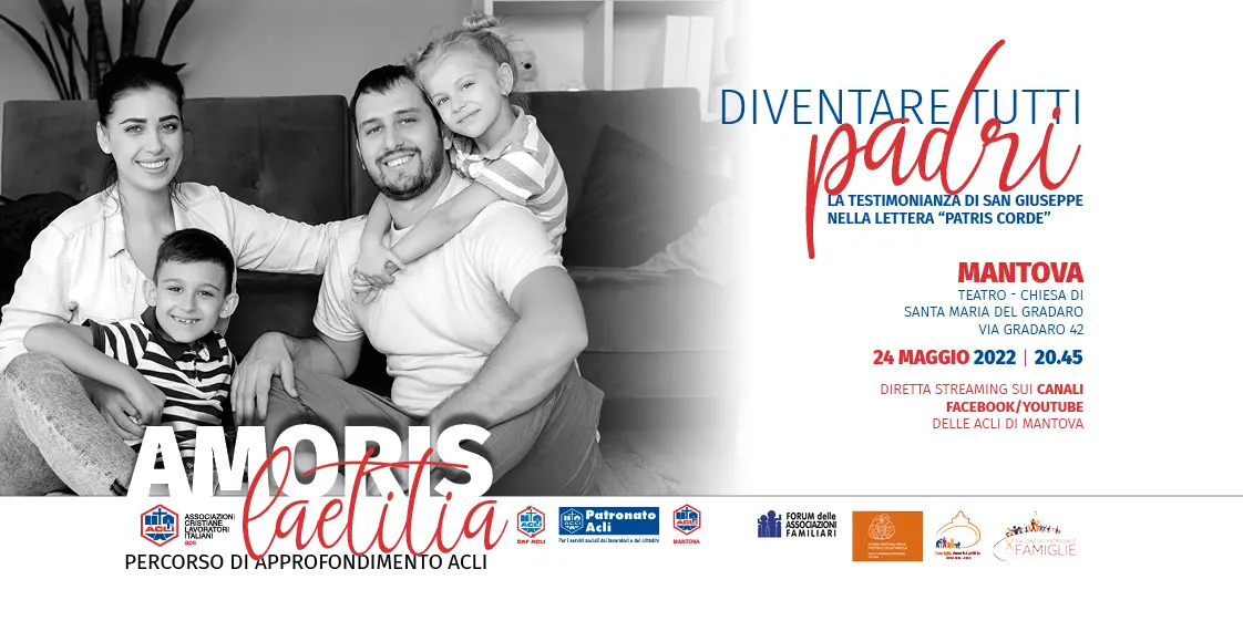 Il 24 maggio a Mantova, alle ore 20.45, presso il Teatro-Chiesa di Santa Maria del Gradaro, via Gradaro 42, si terrà il convegno “Diventare tutti padri. La testimonianza di San Giuseppe nella lettera Patris Corde”, settimo appuntamento di un ciclo seminariale che parte dalla rilettura dell’esortazione apostolica “Amoris Laetitia” e dalla lettera apostolica “Patris Corde” per proporre una riflessione spirituale, culturale e sociale sul ruolo della famiglia, in vista dell’Incontro mondiale delle famiglie che si terrà a Roma il prossimo 22-26 giugno 2022.