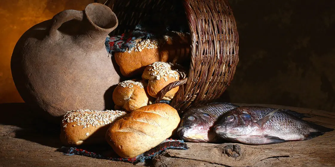 E, dopo aver ordinato alla folla di sedersi sull’erba, prese i cinque pani e i due pesci, alzò gli occhi al cielo, recitò la benedizione, spezzò i pani e li diede ai discepoli, e i discepoli alla folla.