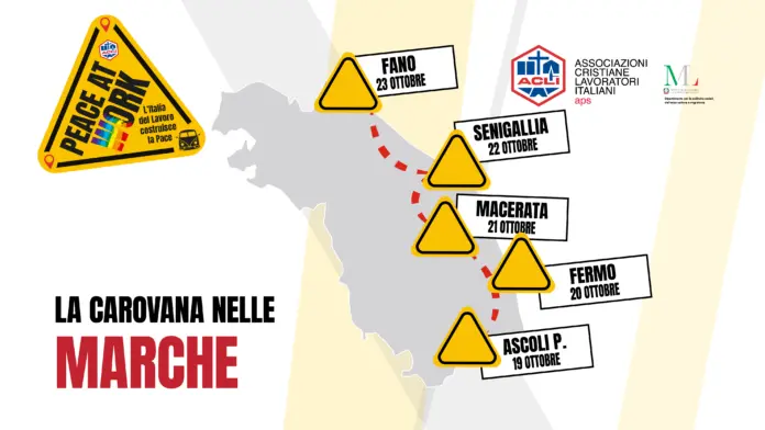 Dopo due intense giornate in Abruzzo, la Carovana della Pace “Peace at Work – L’Italia del lavoro costruisce la pace” prosegue il suo cammino verso le Marche, dove farà tappa dal 19 al 23 ottobre attraversando le città di Ascoli Piceno, Fermo, Macerata, Senigallia e Fano.