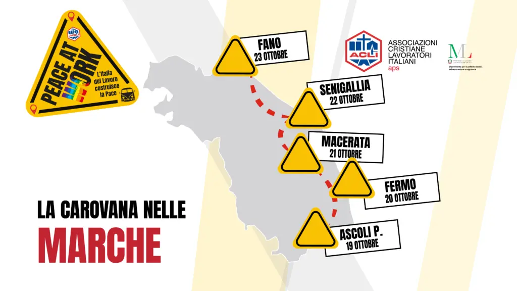 Dopo due intense giornate in Abruzzo, la Carovana della Pace “Peace at Work – L’Italia del lavoro costruisce la pace” prosegue il suo cammino verso le Marche, dove farà tappa dal 19 al 23 ottobre attraversando le città di Ascoli Piceno, Fermo, Macerata, Senigallia e Fano.