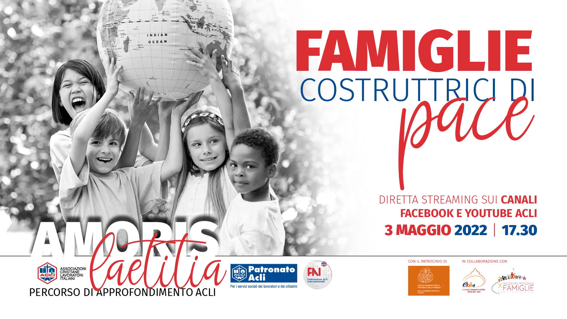 Il 3 maggio in diretta streaming sulla pagina Facebook delle Acli, alle ore 17.30, si terrà l’incontro “Famiglie costruttrici di pace”, sesto appuntamento di un ciclo seminariale che parte dalla rilettura dell’esortazione apostolica “Amoris Laetitia” e dalla lettera apostolica “Patris Corde” per proporre una riflessione spirituale, culturale e sociale sul ruolo della famiglia, in vista dell’Incontro mondiale delle famiglie che si terrà a Roma il prossimo 22-26 giugno 2022.