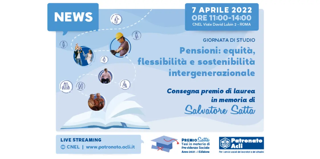 Si terrà giovedì 7 aprile, presso il Parlamentino del CNEL, a Roma, dalle ore 11,00 alle ore 14,00, una giornata di studio conclusiva della prima edizione del Premio di laurea in memoria di Salvatore Satta. Il premio, nato per onorare la memoria dello storico dirigente del Patronato ACLI scomparso nell’aprile 2020, ha l’obiettivo di promuovere lo studio e la ricerca da parte delle nuove generazioni sulla previdenza sociale. La giornata di studio sarà un’occasione per discutere di “Pensioni: equità, flessibilità e sostenibilità intergenerazionale” grazie anche al contributo dei relatori. Introdurrà la giornata il Direttore generale del Patronato ACLI, Nicola Preti a cui seguiranno gli interventi di Tiziano Treu, Presidente del CNEL, Mauro Nori, Segretario Generale del CNEL, Paolo Ricotti, Presidente del Patronato ACLI. I lavori saranno moderati dalla giornalista Giada Valdannini. A seguire si svolgerà la consegna del premio a Fatima Teli, autrice della tesi vincitrice intitolata “Il principio di solidarietà intergenerazionale nell’evoluzione del sistema pensionistico”. La premiazione sarà presieduta da Valerio Martinelli, Segretario del Comitato Scientifico del Premio Salvatore Satta e da Emiliano Manfredonia, Presidente Nazionale ACLI.