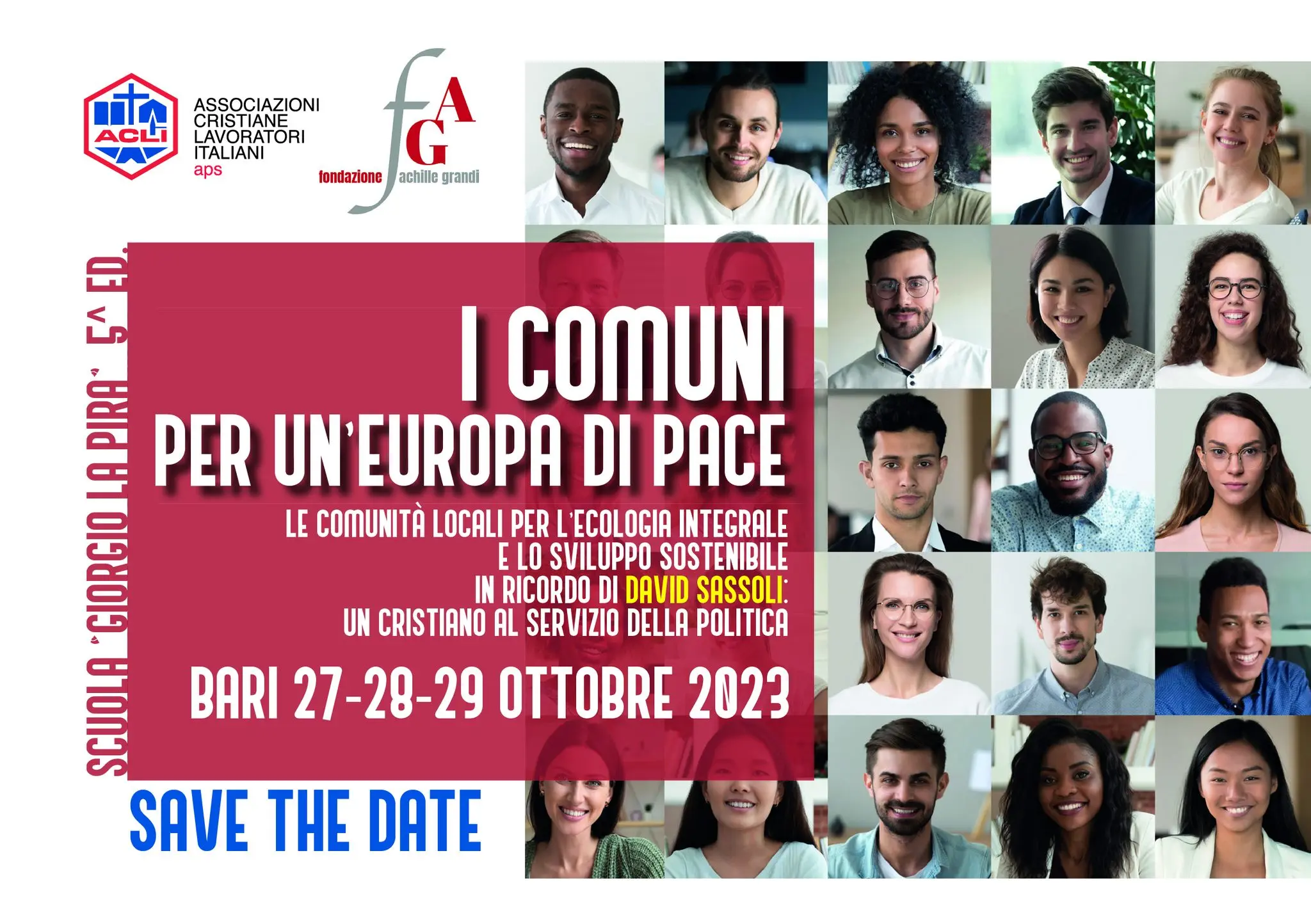 Dal 27 al 29 ottobre a Bari si svolgerà la quinta edizione della Scuola di Formazione Giorgio La Pira, organizzata dalla Fondazione Achille Grandi e dalle Acli nazionali, dal titolo “I Comuni per un’Europa di pace”. Tre giorni di incontri con gli amministratori locali, gli animatori politici e i dirigenti aclisti per discutere sugli scenari politici attuali e proporre riforme per il bene comune.