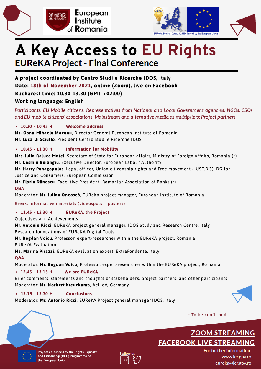 Si terrà il 18 novembre a partire dalle 9,30 ora italiana (le 10,30 in Romania, dove si svolge fisicamente l’evento) il convegno conclusivo del progetto EUReKA – A Key Access to EU Rights