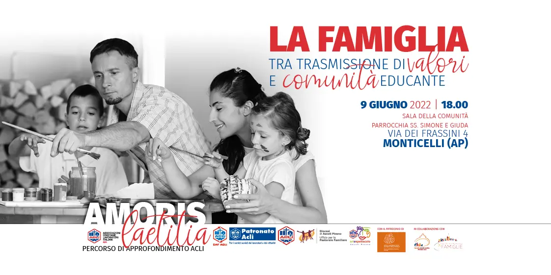 Il 9 giugno a Monticelli (Ascoli Piceno), alle ore 18.00, presso la sala della Comunità Parrocchia SS. Simone e Giuda, via dei Frassini 4, si terrà il convegno “La famiglia tra trasmissione di valori e comunità educante”, ottavo appuntamento di un ciclo seminariale che parte dalla rilettura dell’esortazione apostolica “Amoris Laetitia” e dalla lettera apostolica “Patris Corde” per proporre una riflessione spirituale, culturale e sociale sul ruolo della famiglia, in vista dell’Incontro mondiale delle famiglie che si terrà a Roma il prossimo 22-26 giugno 2022.