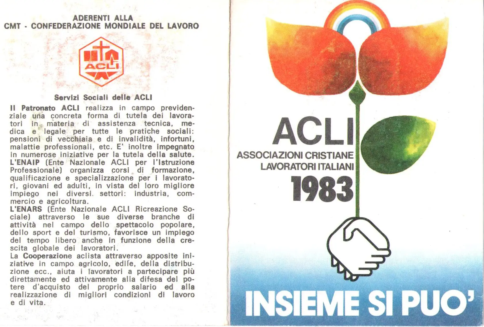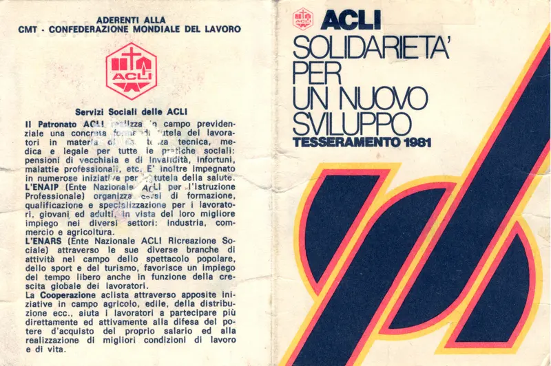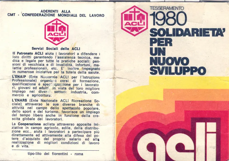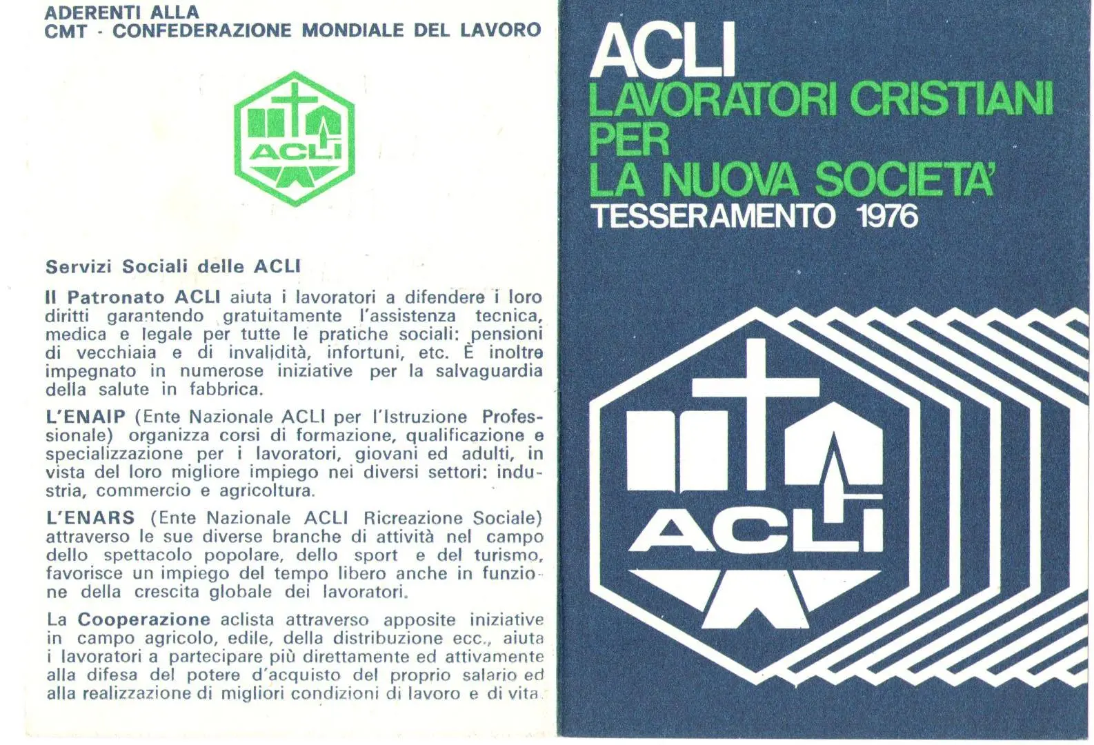 Nel decennio preso in considerazione sul retro delle tessere viene costantemente ricordata l’apertura delle ACLI ai problemi dei lavoratori di tutto il mondo, con l’adesione alla CMT (Confederazione Mondiale del Lavoro) e l’orgoglioso elenco dei servizi sociali offerti dall’associazione in diversi campi: il Patronato, l’Enaip, l’Enars e la Cooperazione.