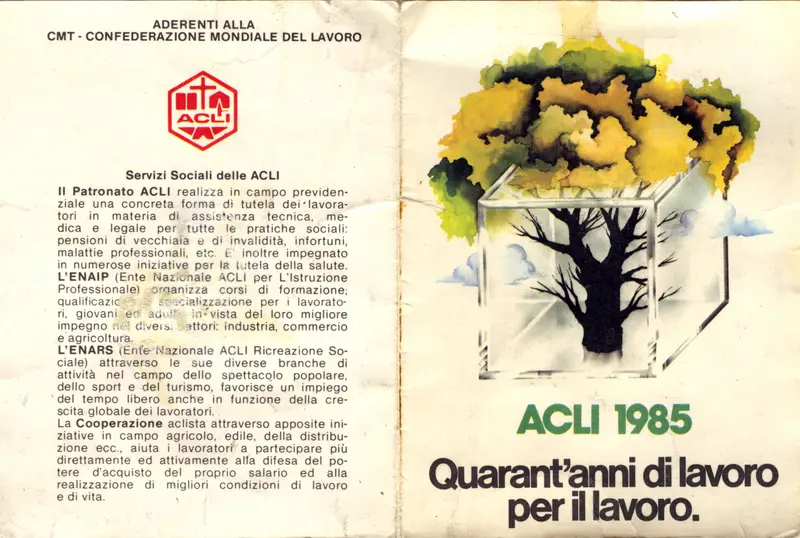 La tessera del quarantennale della nascita del 1985 ricorda semplicemente quale sia la funzione principale delle ACLI: Quarant’anni di lavoro per il lavoro.