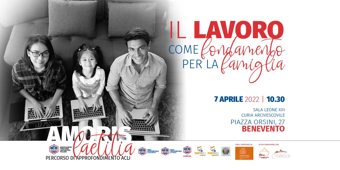 Il 7 aprile a Benevento, alle ore 10.30, presso la Sala Leone XIII della Curia Arcivescovile, in piazza Orsini 27, si terrà il convegno “Il lavoro come fondamento per la famiglia”, quinto appuntamento di un ciclo seminariale che parte dalla rilettura dell’esortazione apostolica “Amoris Laetitia” e dalla lettera apostolica “Patris Corde” per proporre una riflessione spirituale, culturale e sociale sul ruolo della famiglia, in vista dell’Incontro mondiale delle famiglie che si terrà a Roma il prossimo 22-26 giugno 2022.