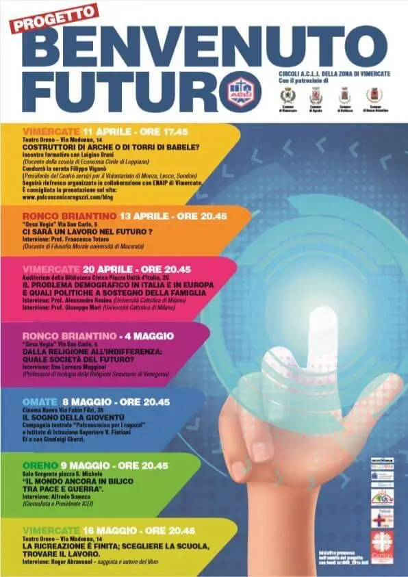 Si parte l’11 aprile con il primo appuntamento in programma: Costruttori di arche o di Torri di Babele? a Vimercate, per proseguire il 13 aprile con l’incontro Ci sarà un lavoro nel futuro? A Ronco Briantino. Terza tappa – sempre a Vimercate il 20 aprile – e terzo dibattito Il problema demografico in Italia e in Europa e quali politiche a sostegno della famiglia; proseguendo ancora a Ronco il 4 maggio con l’incontro Dalla religione all’indifferenza: quale società del futuro? A Omate e Oreno, l’8 e 9 maggio, si parla del Sogno della gioventù e de Il mondo ancora in bilico tra pace e guerra e si conclude di nuovo a Vimercate il 16 maggio con La ricreazione è finita: scegliere la scuola, trovare il lavoro.