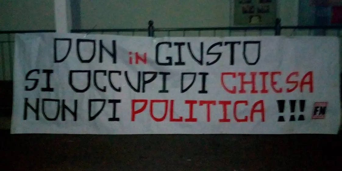 Cari signori di Forza nuova, perlomeno così vi siete designati, mi sarebbe piaciuto veniste a parlare a casa mia con tutta calma, in pieno giorno, anzichè affiggere nottetempo un vostro cartello sulla recinzione dell’oratorio di Rebbio. Comunque, il vostro scritto notturno mia ha dato una nuova forza in due direzioni: – innanzitutto a lottare contro il male che c’è in me – mi avete chiamato “ingiusto” – e ne sono cosciente; – in secondo luogo mi sento onorato se voi avete identificato in me una persona della Chiesa di Como che fa politica; vi ringrazio. La Chiesa fa politica, ha a cuore la “polis” ed i più fragili della polis. Il Regno di Dio, il cui annuncio è al cuore della vita del nostro fondatore, è Regno di Pace e di Giustizia e beati sono coloro che iniziano a costruirlo su questa terra. Grazie quindi per avermi ricordato e confermato in questi due obiettivi su cui continuo a lavorare insieme a tantissime persone di Como. Giusto Della Valle parroco di Rebbio