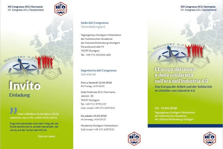 Il congresso sarà suddiviso in due momenti: un approfondimento sulla situazione dei lavoratori e gli aspetti etico-sociali del rapido sviluppo della cosiddetta Industria 4.0, che si svolgerà nella prima giornata e una riflessione sulle prospettive dell’Associazione in Germania.