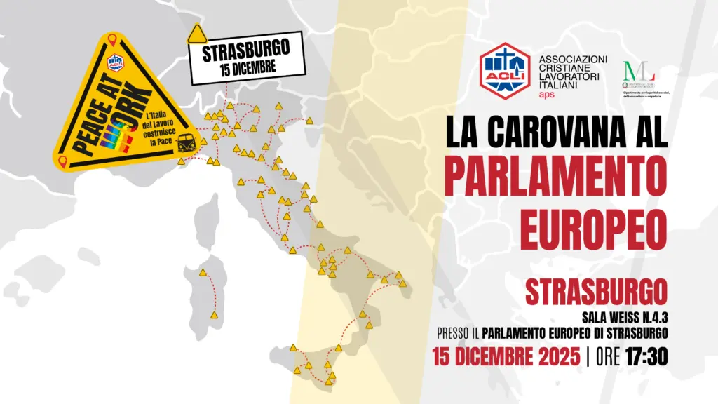 La Carovana Peace at Work chiude il suo viaggio con una tappa speciale in Europa: l’incontro al Parlamento Europeo di Strasburgo, dove le ACLI presenteranno sette proposte concrete per rilanciare l’impegno europeo sulla pace, frutto del confronto con territori, comunità, istituzioni, giovani e lavoratori incontrati lungo tutto il percorso.