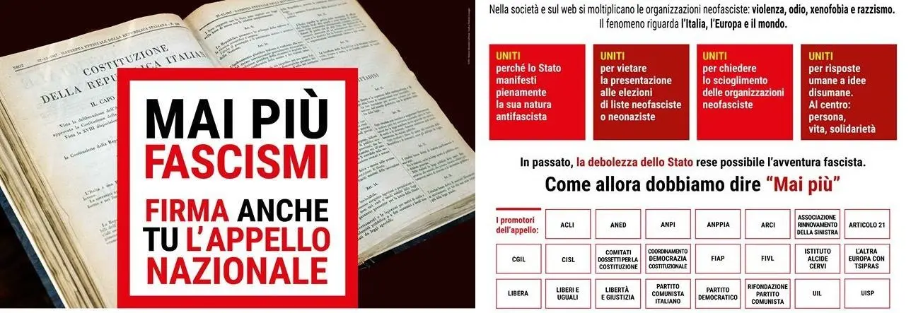 “Si stanno moltiplicando nel nostro Paese sotto varie sigle organizzazioni neofasciste o neonaziste presenti in modo crescente nella realtà sociale e sul web – sostengono i promotori dell’appello -. Vogliamo dare una risposta umana a tali idee disumane affermando un’altra visione delle realtà che metta al centro il valore della persona, della vita, della solidarietà, della democrazia come strumento di partecipazione e di riscatto sociale”.