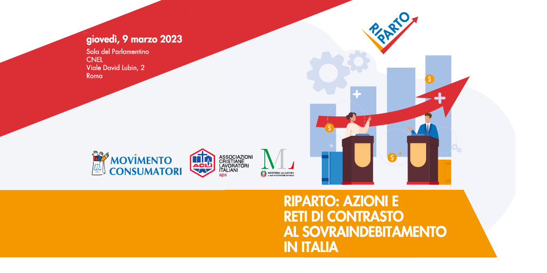 Giovedì 9 marzo a Roma alle ore 9.00, presso la Sala del Parlamentino del CNEL, Viale David Lubin, n.2, Movimento Consumatori e le Acli presenteranno i primi risultati del progetto “RIPARTO – Percorsi di inclusione finanziaria e di accompagnamento per la gestione e soluzione delle situazioni di sovraindebitamento per la ripartenza”, un’iniziativa che nasce per affrontare, concretamente, la problematica del sovraindebitamento.