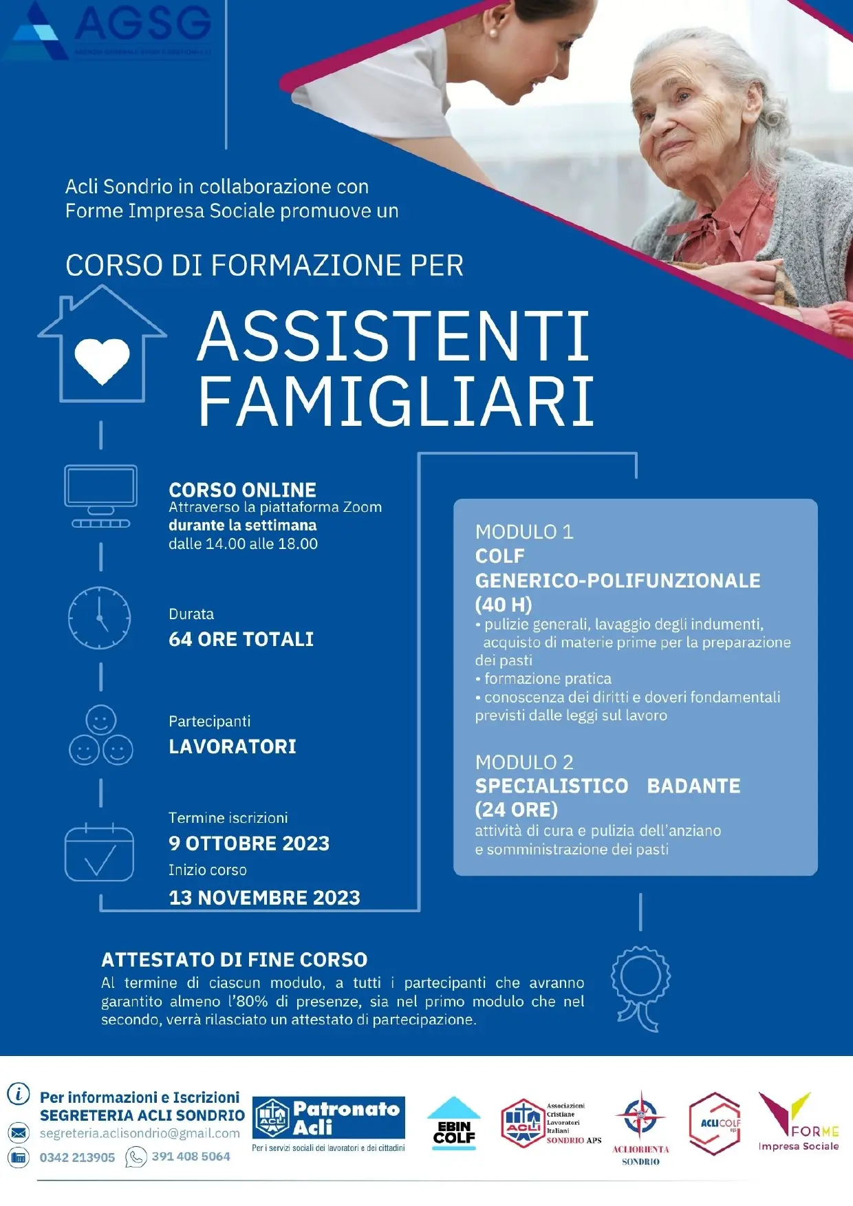Parte il prossimo 13 novembre il corso gratuito per assistenti familiari organizzato dalle Acli Colf di Sondrio.