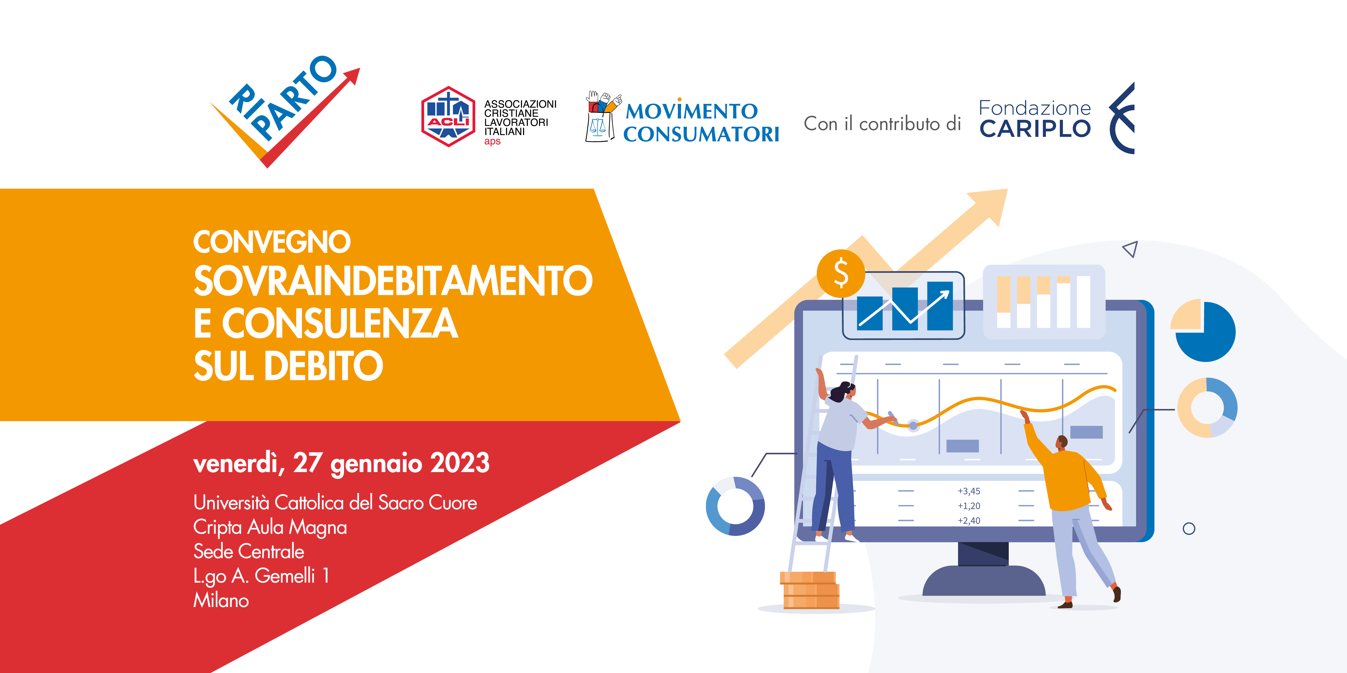 Il 27 gennaio, dalle ore 8.30 alle 17.00, presso l’Università Cattolica del Sacro Cuore di Milano, Largo Gemelli, 1, si svolgerà il convegno “Sovraindebitamento e consulenza sul debito”. L’evento nasce all’interno del progetto “RIPARTO – Percorsi di inclusione finanziaria e di accompagnamento per la gestione e soluzione delle situazioni di sovraindebitamento per la ripartenza”, promosso dal Movimento Consumatori e dalle ACLI per affrontare, concretamente, la problematica del sovraindebitamento.