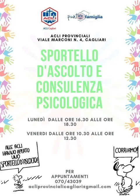 Per questo le Acli di Cagliari hanno deciso di aprire uno sportello gratuito, attivo due volte a settimana nella sede provincialedi viale Marconi, 4. Il lunedì pomeriggio dalle 16.30 alle 18.30 e il venerdì mattina dalle 10.30 alle 12.30, una psicologa sarà a disposizione per offrire ascolto, sostegno e consulenza nella gestione di qualsiasi difficoltà o problematica ci si trovi ad affrontare nelle diverse fasi della propria vita.