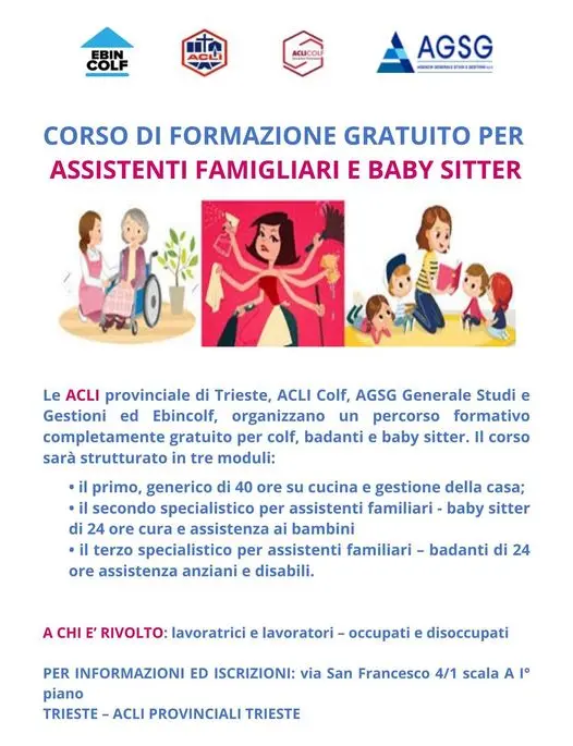 Le Acli Colf di Varese, in collaborazione con Enaip e le Acli di Varese, organizzano un corso completamente gratuito per Assistenti familiari della durata di 64, con inizio il prossimo 15 maggio. Ai nastri di partenza anche Trieste, che sta organizzando il medesimo corso di analoga durata.